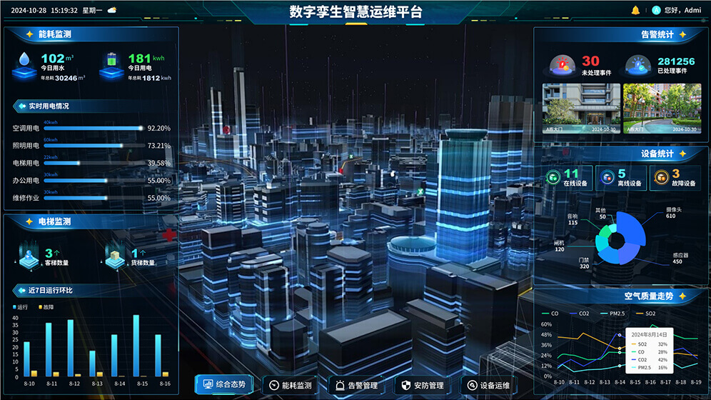 通过大屏全景展示运行状态,监测各类业务数据,实现建筑空间的全面感知和可持续运营